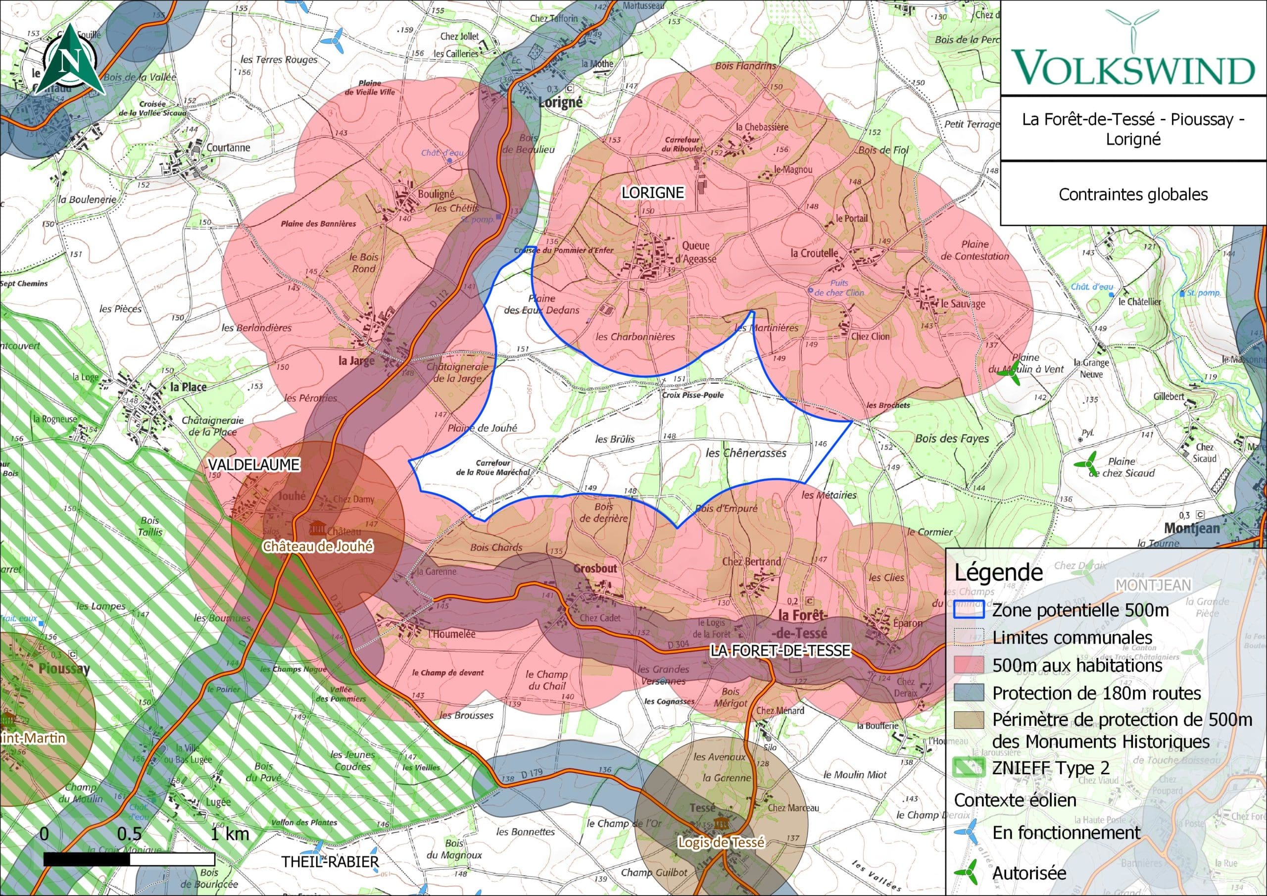 La zone d’étude répond à l’éloignement réglementaire de 500 m minimum des habitations et laisse la possibilité technique d’une implantation à plus de 600m. Les études écologiques, paysagères et acoustiques ont permis de conclure à la faisabilité d’un projet éolien sur la zone.