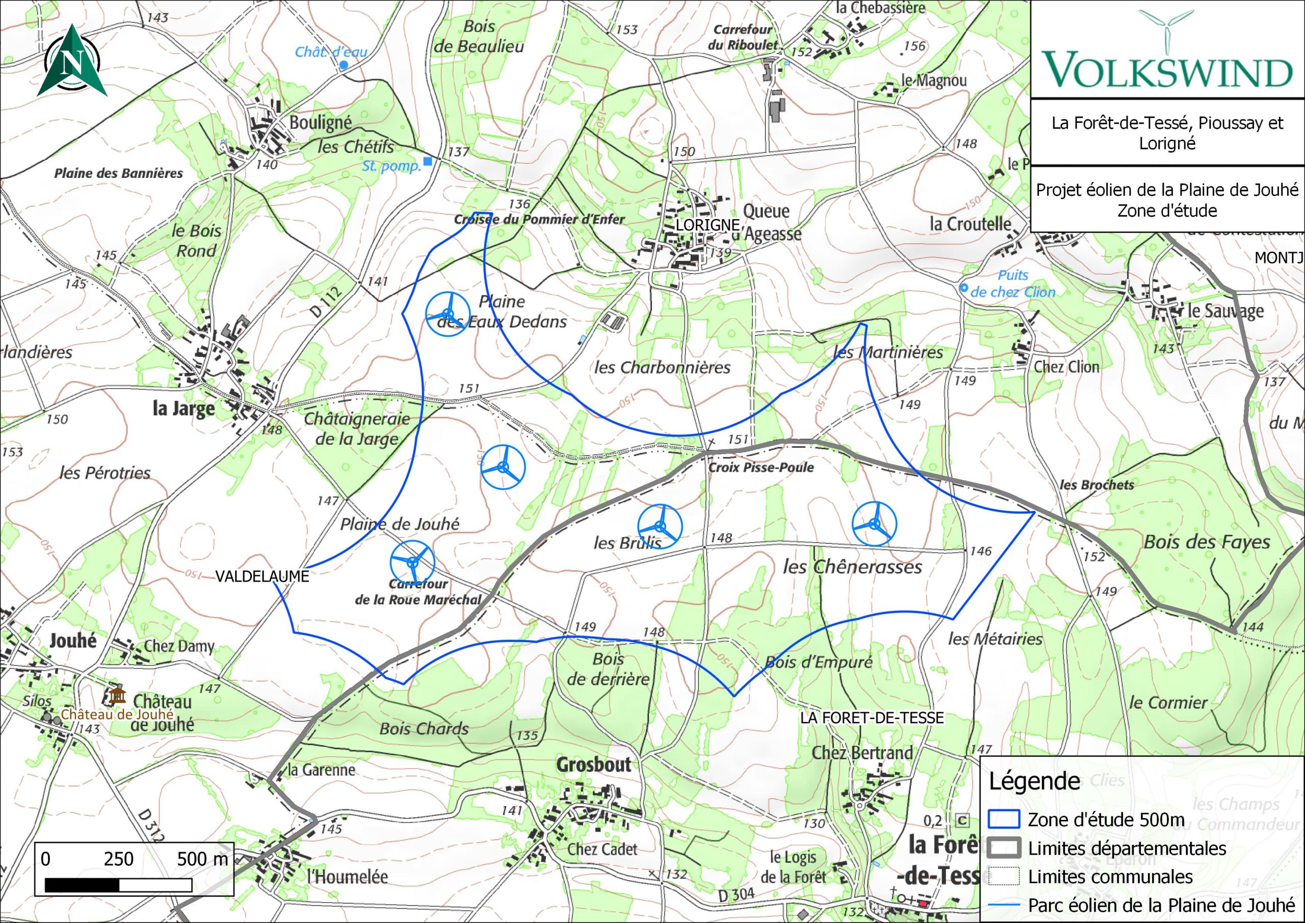 Le projet éolien de la Plaine de Jouhé est situé à la frontière de deux départements sur les communes de Valdelaume et Lorigné (en Deux-Sèvres) et la Forêt-de-Tessé (en Charente). Il est entouré à l’Est par la route départementale D112 et au nord par la départementale D304.